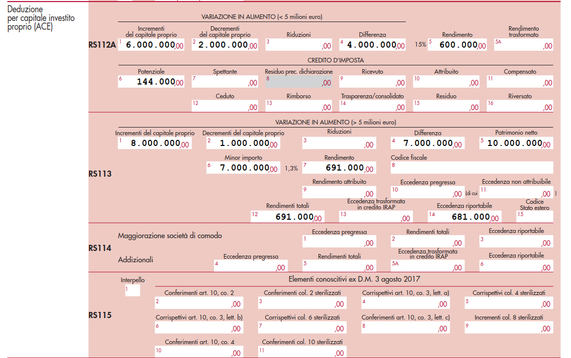 Tra le misure introdotte per incentivare la capitalizzazione durante l’emergenza Covid-19 vi è la Super ACE, che consente di applicare, ai fini della determinazione del reddito d’impresa per il periodo d’imposta 2021, un rendimento nozionale del 15% (anziché l’1,3%) per la variazione in aumento del capitale proprio sino ad un ammontare massimo di incremento pari a € 5 milioni. Rimanendo quindi ferma l’agevolazione ACE ordinaria (con aliquota all’1,3%) sugli incrementi patrimoniali netti registrati sino al 31 dicembre 2020 o per gli incrementi superiori ai 5 milioni registrati nel 2021, solo per il 2021 opera parallelamente anche la Super ACE: l’articolazione dell’agevolazione ha richiesto quindi una corrispondente modifica, nel quadro RS, del prospetto per l’applicazione della disciplina ACE. È stato, in particolare, suddiviso il rigo relativo al calcolo dell’agevolazione in due distinti righi: il primo (RS112A) si concentra sulle variazioni in aumento del capitale sino a € milioni (destinato quindi al computo della Super ACE), mentre il secondo (RS113) si concentra su quelle che superano la soglia di € 5 milioni ai fini del computo dell’ACE ordinaria. Si ponga il caso della società Alfa, in attività dal 2018, che ha registrato i seguenti incrementi/decrementi patrimoniali: