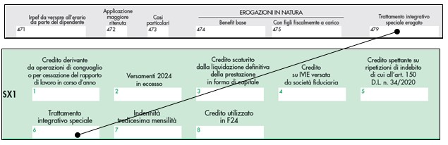Due le novità importanti che confluiscono nel quadro SX: indicazione del credito relativo al trattamento integrativo speciale del lavoro notturno e straordinario; indicazione del credito maturato dal sostituto d’imposta che ha erogato l’indennità tredicesima mensilità (cd. Bonus Natale). Trattamento integrativo speciale Nel rigo SX1 colonna 6, deve essere indicato il credito maturato per effetto dell’erogazione del trattamento integrativo speciale del lavoro notturno e straordinario, (art. 1, c. 21 a 25, L. 213/2023) riconosciuto dal sostituto per il semestre dal 1° gennaio al 30 giugno 2024. L’importo corrisponde alla somma indicata nel campo 479 delle CU/2025 trasmesse.