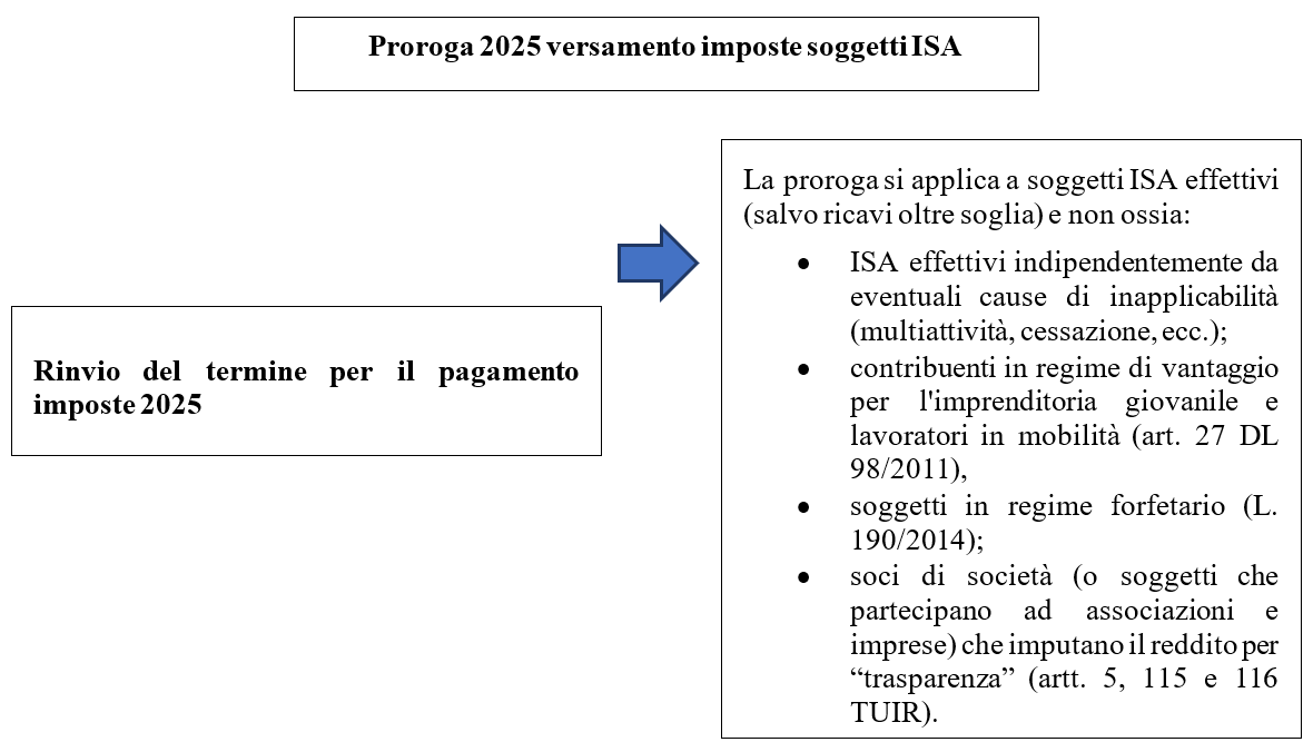 Premessa Entro il prossimo 21 luglio i soggetti ISA effettivi e non, potranno effettuare il versamento delle imposte inerenti alle dichiarazioni dei redditi (IRFEF e IRES), dell'IRAP e dell'IVA senza applicare alcuna maggiorazione. Il pagamento potrà essere effettuato inoltre, nei 30 gg successivi al 21 luglio ossia dal 22 luglio al 20 agosto 2025, con la maggiorazione dello 0,4% a titolo di interesse corrispettivo. Per coloro che riportano crediti in compensazione in F24, la maggiorazione si applica solamente sulla differenza tra debiti e crediti, se positiva. Decorsi tali termini, si aprirà la chance di ravvedimento operoso che dovrà prendere a riferimento il termine entro il quale si è scelto di eseguire l'originario versamento da correggere, per quest'anno 21 luglio o 20 agosto ovvero 30 giugno o 30 luglio per i soggetti non interessati dalla proroga. Soggetti ISA. La proroga per il versamento delle imposte La proroga per il versamento delle imposte in favore dei soggetti ISA effettivi e non, è stata disposta dall'art. 13 DL 84/2025.