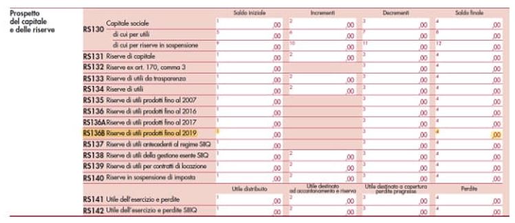Nel “Prospetto del capitale e delle riserve” è stato aggiunto il rigo RS136B “Riserve di utili prodotti fino al 2019” in cui va indicata la quota relativa all'ammontare delle riserve alimentate con utili prodotti fino all'esercizio in corso al 31 dicembre 2019, per i quali in caso di distribuzione alle società semplici deliberata entro il 31 dicembre 2022 continua ad applicarsi la disciplina previgente a quella prevista dall'art. 1 c. 999-1006 L. 205/2017 (art. 32-quater 124/2019). La necessità di monitorare gli utili prodotti fino all'esercizio in corso al 31 dicembre 2019 per la gestione del periodo transitorio ha prodotto il rigo RS136B “Riserve di utili prodotto sino al 2019” nel quale vanno indicati: Colonna 1 La quota relativa all'ammontare delle riserve alimentate con utili prodotti fino all'esercizio in corso al 31 dicembre 2019, per i quali in caso di distribuzione alle società semplici deliberate entro il 31 dicembre 2022 continua ad applicarsi la disciplina previgente a quella prevista dall'art. 1 c. 999-1006 L. 205/2017 (art. 32-quater 124/2019) Colonna 3 L'importo dei decrementi delle riserve verificatisi nel corso dell'esercizio, per effetto delle distribuzioni o per effetto della copertura di perdite di bilancio nonché per effetto dell'imputazione a capitale di tali riserve. Colonna 4 L'importo risultante dalla somma algebrica degli importi indicati nei campi precedenti (colonna 1 - colonna 3 = colonna 4). |